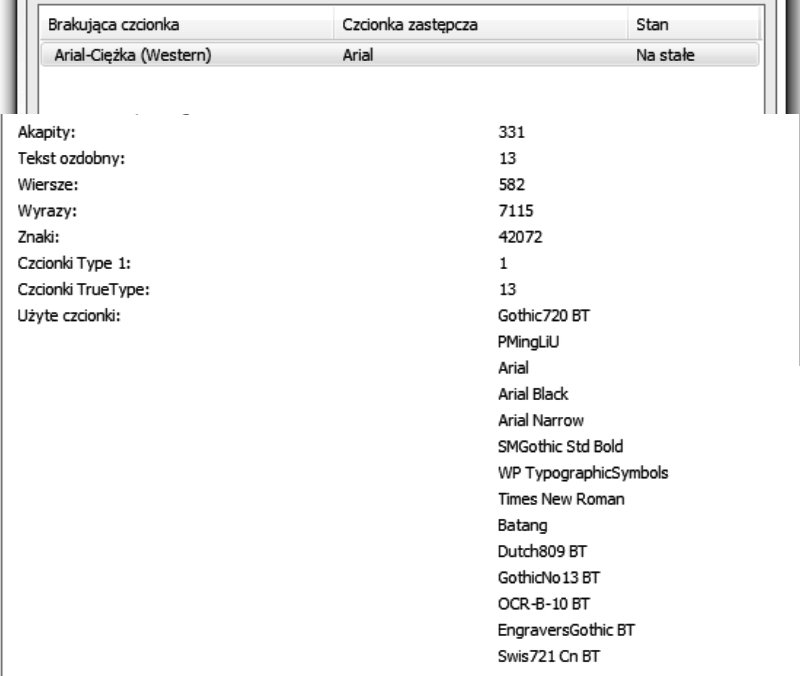 Co do usuwania czcionek - nie mogę usunąć czegoś, czego w dokumencie nie ma. Corel ma omamy i to jest tragiczne, bo we właściwościach podaje po prostu jakieś wydumane informacje. Jak widzisz lista czcionek jest imponująca, choć użyte jest dokładnie 5 (pięć). Teraz sobie wyobraź, że dostajesz coś takiego od klienta i musisz wszystkie czcionki znaleźć i podmienić, bo nie wiesz która jest, a jak będzie niewłaściwa to projekt się rozsypie (nie każdy chce zmieniać na krzywe z wielu powodów). Miałam dokument napisany Arialem, w którym Corel chciał podmieniać ponad dwadzieścia czcionek. Klient po prostu próbował różnych, w końcu poprzestał na zwykłym Arialu. A ta pamiętliwa bestia wszystko zapamiętała, z wyjątkiem tego jaka w końcu czcionka w dokumencie występuje.
