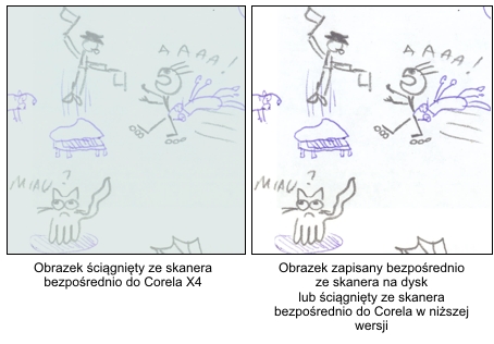 U nas w firmie wszyscy korzystamy z tego skanera (konica minolta c6500) - skan można ściągnąć bezpośrednio z hdd maszyny i zapisać go na dysku u siebie lub też ściągnąć ze skanera od razu przez corela do wykonywanej pracy. No i gdy zauwazylam, ze tylko ja mam problem, to postanowilam zrobic maly test z jednym obrazkiem - tak się udało, że pod ręką miałam jakieś glupawe bazgroły, które zrobiłam jeszcze na studiach na jakims durnym wykładzie z nudów, ale to już nieważne. rysunek ołówkiem i długopisem na białej kartce to był dobry materiał do testu. najpierw ściągnęłam skan przez corela - wyszedl szary. później przesiadłam się na komputer kolegi (corel 9) - skan wyszedł dobrze. postanowiłam z powrotem przesiąść się do siebie i spróbować bezpośrednio z hdd na swoj dysk - po zapisie okazalo sie ze plik jest w porzadku, tak więc wskazuje jednoznacznie na corela x4 jako winowajce.. dolaczam plik z fragmentem tego glupawego rysunku :)