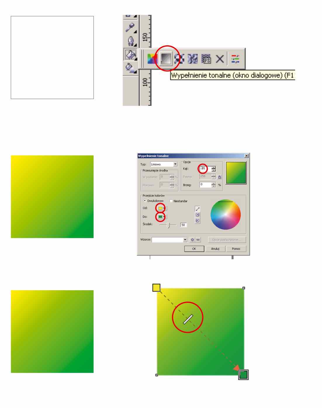 2)jest kwadrat wypelnienie jest zielone,no i teraz chce wziasc jakis gradient zaznaczyć że ma dawać żółty kolor, klikam w lewym górnym rogu kwadratu i ciagne do dolnego prawego rogu kwadratu,no i poprostu robi przejscie tonalne,z lewej strony idzie żółly kolor potem robi się coraz słbaszy i przechodzi w zielony(czyli w to tło)....nie wiem jak to można inaczej tłumaczyć... :)