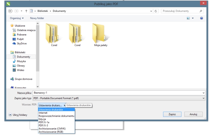 pikaska - a czy jak rozwiniesz combobox WZORZEC PDF gdzie masz wpisane USTAWIENIE DRUKARSKIE to co masz tam do wyboru? Nie ma czasem na dole rozwijanej listy czegoś w rodzaju ZAAWANSOWANE... lub USTAWIENIA... ?