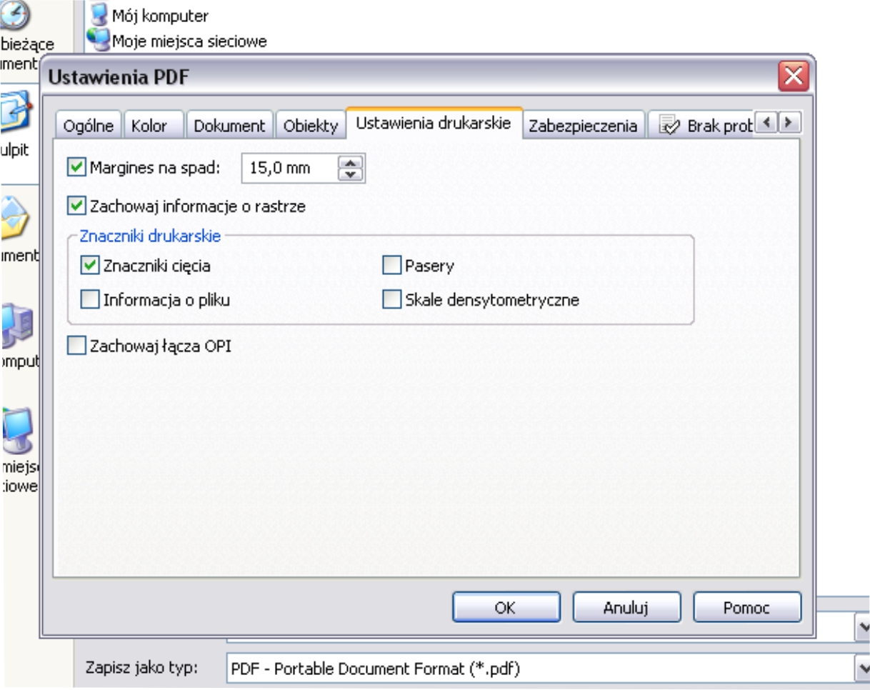 Jeśli drukujesz na drukarce postscriptowej to obszar spadu wybierasz w zakładce układ i tam wpisujesz odpowiednią wartość, znaczki się wtedy odsuną automatycznie, jak w załączonym obrazku.