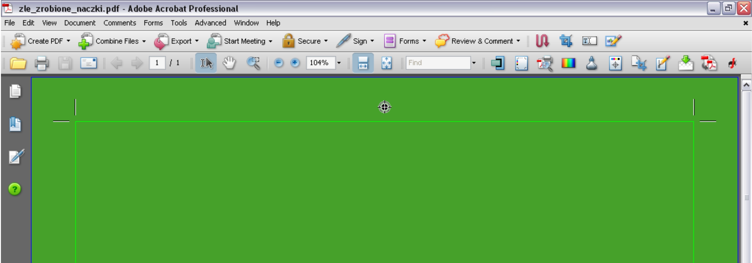 Jeszcze tak dla wyjaśnienia. Pokazałam na przykładzie 15mm ponieważ tyle spadu jest wymagane np. na kaszerowaną główkę do kalendarzy trójdzielnych i na oklejkę do twardej oprawy na książkę. Wiem, że wielu grafików sobie z tym nie radzi i często dostajemy coś jak w załączniku. Oczywiście w takim przypadku wszystkie znaczki się wydrukują i będą widoczne po otwarciu książki. Przed zrobieniem impozycji z pięknym uśmiechem na ustach i pozdrowieniami dla grafika usuwam je ręcznie w akrobacie...