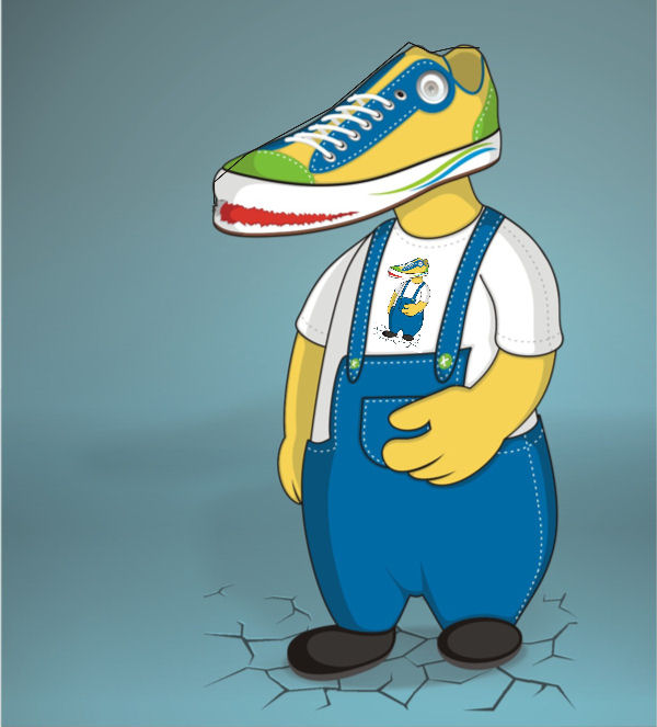 Pomysł faktycznie dobry, pomimo tego, że ciut schiza. Wykonanie absolutnie poprawne. Jednak miałbym jedno zastrzeżenie pod względem braku konsekwencji co do stopnia skomplikowania/detali. Wszystko poza głową masz w prostej, komiksowej kresce o grubych konturach i wyrazistych kolorach na dużych płaszczyznach. Jednak głowotrampek jest prawie że fotorealistyczny z wieloma drobnymi szczegółami i nawet gradientem - to się trochę gryzie, bo na reszcie masz twarde jednopoziomowe cienie. Myślę, że dj_maras wskazuje Ci dobry kierunek jeśli chodzi o kompozycję. A głowa może od razu kojarzyć się z trampkiem przez odpowiedni kształt i krzyżujące się sznurówki i wydzielenie podeszwy i cholewki - wtedy nie będzie potrzebował każdego szwu ani nawet zachowania proporcji ;-)
