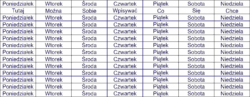 Napisać PONIEDZIAŁEK WTOREK SRODA CZWARTEK PIATEK SOBOTA NIEDZIELA. Górny wiersz tabeli powinien składać się z 7 rozgrupowanych i rozłączonych prostokątów. Należy wyrównać tekst do dowolnego z nich w pionie, rozłączyć i każdy wyraz goumieścić we właściwym prostokącie centrując go do niego w poziomie.