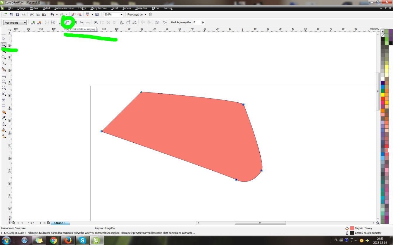 Jedna rada techniczna .Rysując jakąś formę Krzywą Beziera gotowy rysunek zaznacz narzędziem Kształt ,następnie kliknij w górnej belce na Przekształć w krzywą .Od tego momentu będziesz mógł prostą poprawić na płynne łuki, z prostokąta robić elipsę itp.