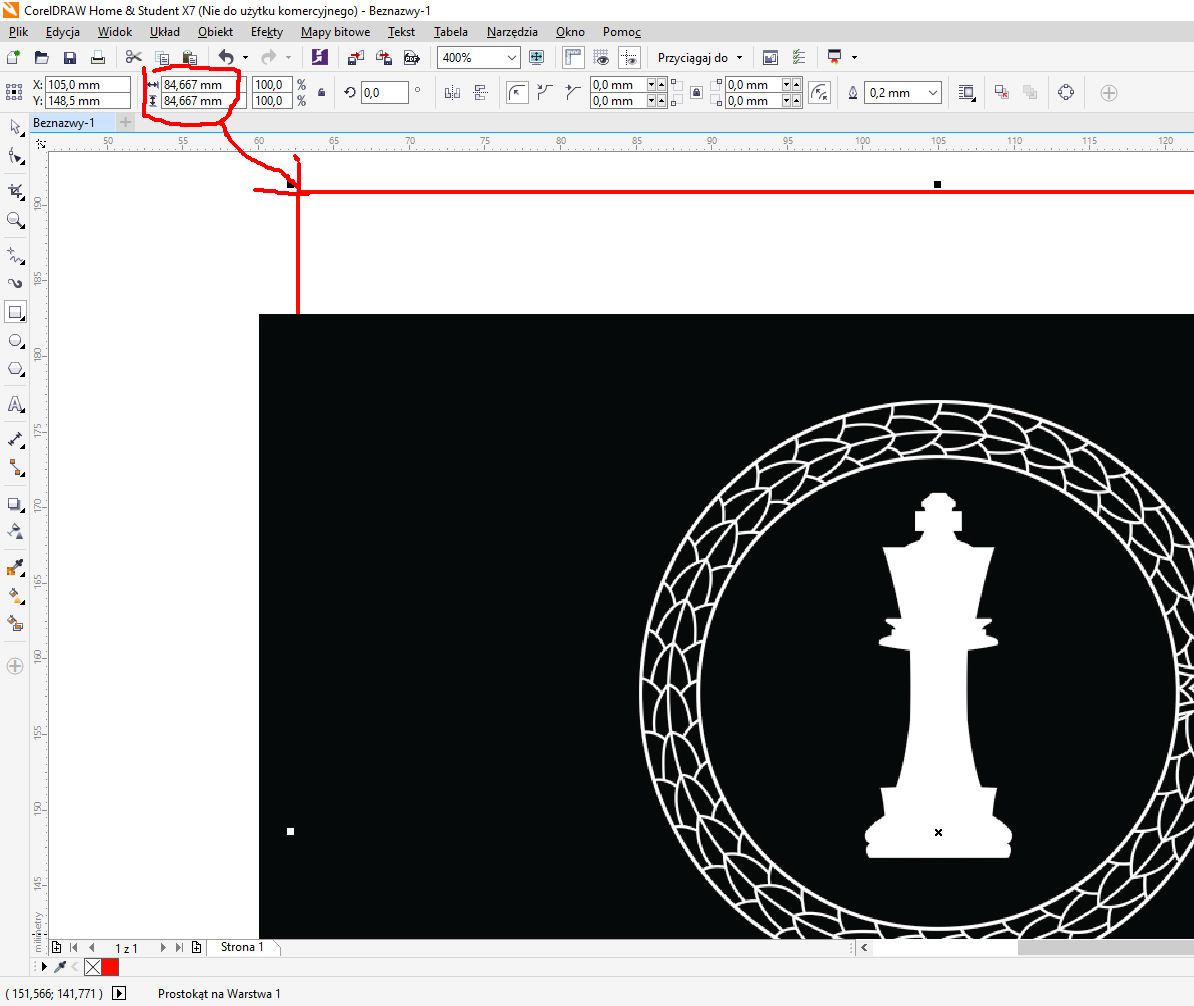 Zrób stronę o rozmiarach 81x81 mm. Czarny kwadrat w tle zrób większy, przynajmniej o te 4 mm z każdej strony.