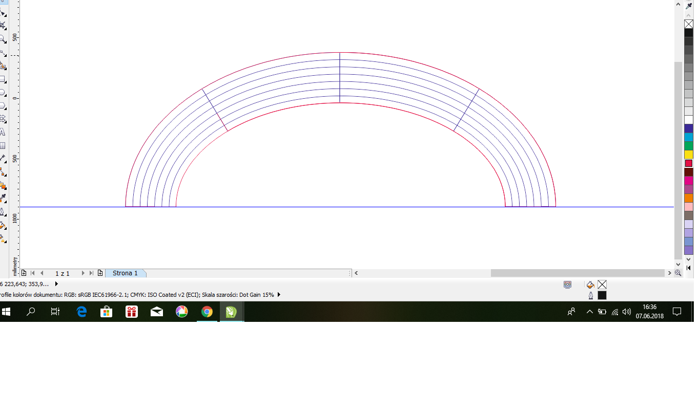 Narysowałam w corelu taką tęczę. muszę ją teraz wyciąć na ploterze frezującym cnc. Problem jest w tym ze pole robocze plotera to 100x150 cm a cała tęcza ma ponad 3 metry.