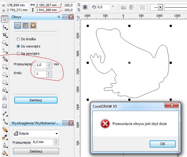 Corel X5 zgłasza błąd że obrys jest za duży.