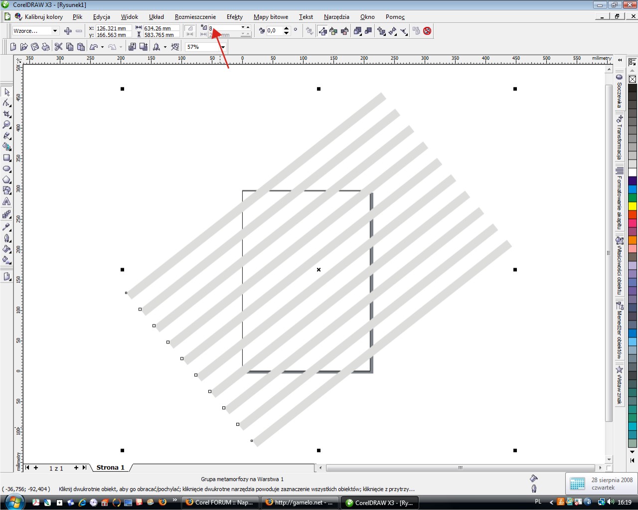 Jest kilka sposobow na rozwiazanie tego "problemu". Ja bym zroblia np. tak: Rysujesz dluuuugi i waski prostokąt, kolorujesz go na odpowiedni szary kolor, potem obracasz o 45 stopni. Ustawiasz go jako gorny pasek (nie zwazasz ze wychodzi poza strone), kopiujesz, ustawiasz drugi jako dolny pasek. Z przybornika wybierasz interakyjna metamorfoze, wskazujesz pierwszy i drugi prostokat (rys1). Okreslasz liczbe krokow (rys2). Na koniec zeby prostokaty nie wystawaly poza strone wrzucasz je w kadr: najpierw prostokat wielkosci calego tla, potem klikasz w szare prostokaty, wybrierasz z Menu Efekty -> Szybkie kadrowanie -> Umiesc w kadrze i wskazujesz duzy prostokat. I juz... :)