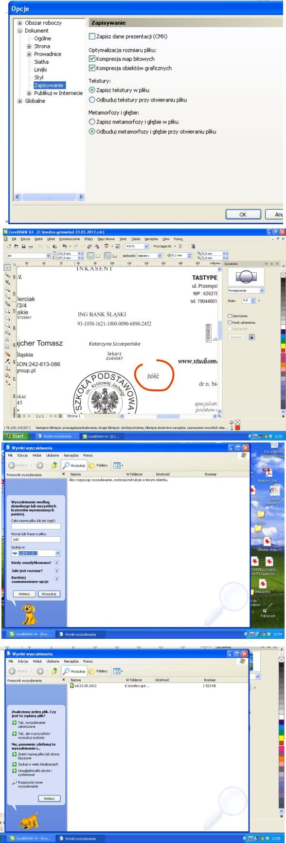 | tegraf napisał/a: | | "Goły" tekst jest dostępny w plikach cdr, o ile przy zapisywaniu zostanie wyłączona kompresja obiektów graficznych. Wtedy wyszukiwanie tekstu w plikach cdr za pomocą wyszukiwarki Windows jest możliwe. | Której wersji Corela to dotyczy? Bo w X5 nie działa ani w przypadku tekstu akapitowego, ani ozdobnego. |