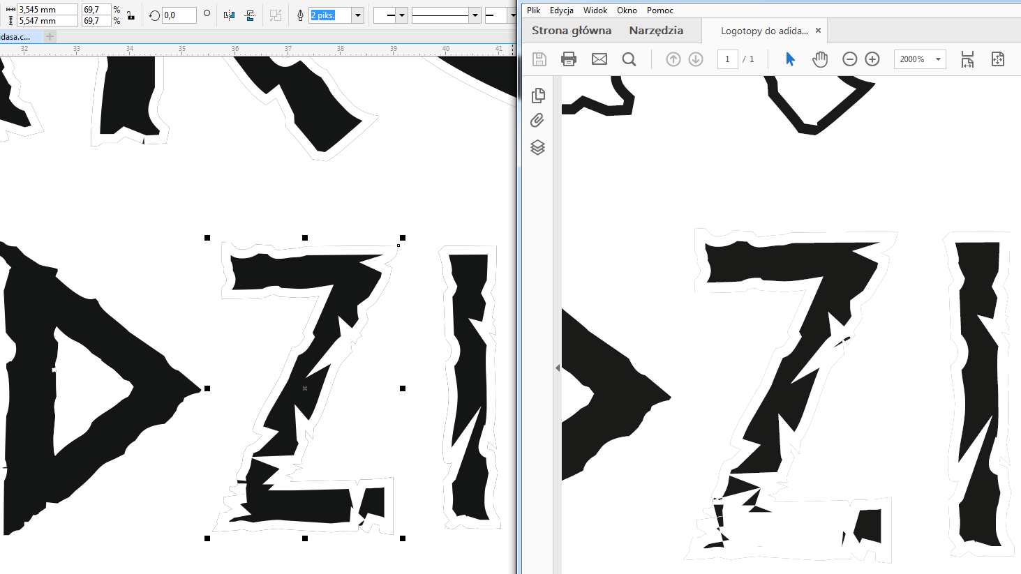 Mianowicie chodzi o to, że plik wyeksportowany - czasem nie wygląda tak jak skrzywiony wzór w CDR. Przykład w załączniku. Po lewej stronie wzór jest OK, po prawej po eksporcie do PDF litera Z jest 'uszkodzona'.