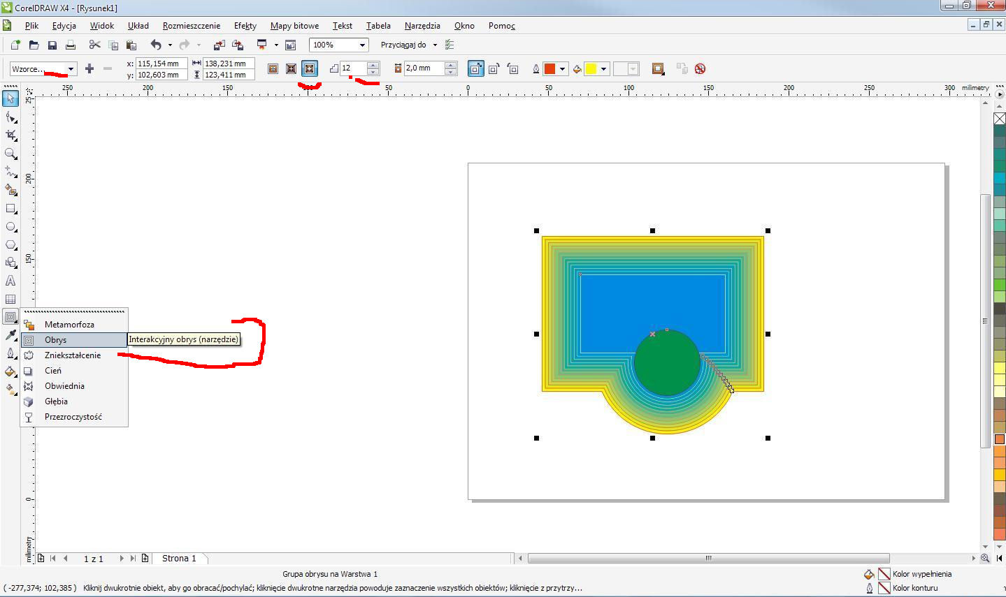 Pamiętaj że szerokość konturu 1mm jest ustawiona do wewnątrz i na zewnątrz danej krzywej. Żeby dodać w twoim przypadku wartość 1mm na zewnątrz musisz jeszcze ustawić w oknie Właściwości Obiektu - kontur zewnętrzny. Wtedy dopiero będziesz miał kontur zewnętrzny na 1mm.