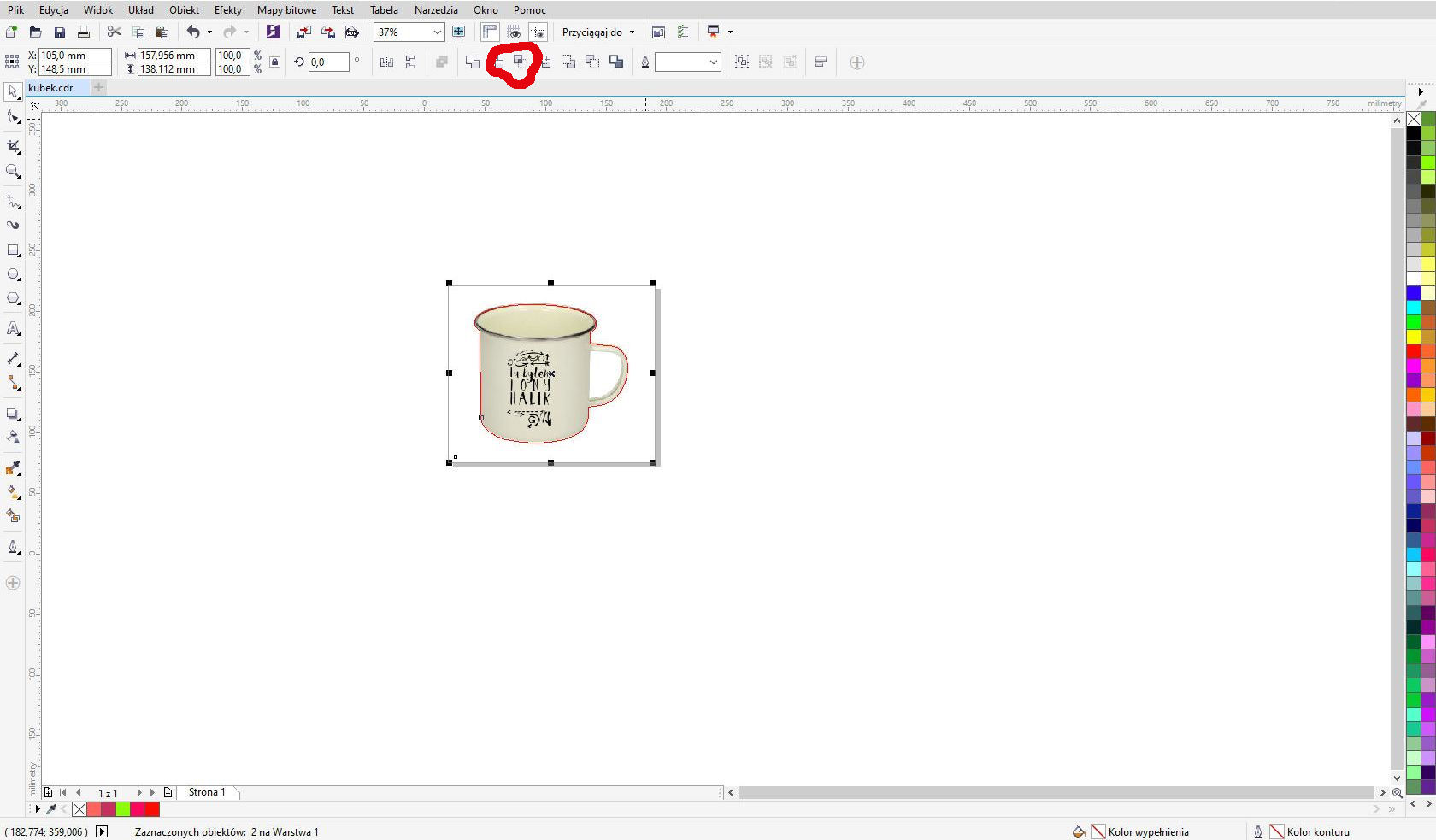 Zaznacz narzędziem wskaźnik obrys który wykonałaś (chyba ucho kubka nie jesyt połaczone )i wybierz opcję połącz . Powinna uaktywnić się opcja Przekształć kontur w obiekt .