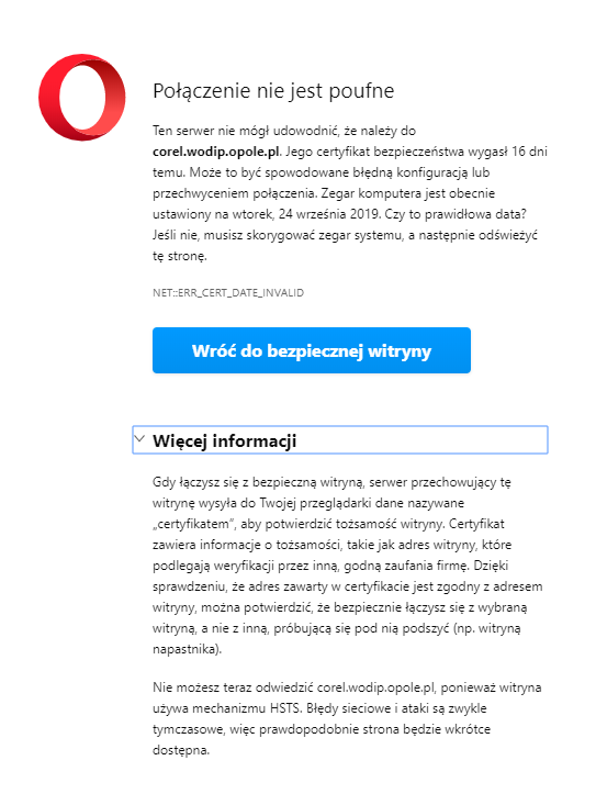 Usuniecie certyfikatu z listy w Ustawieniach w Operze nie dawało rezultatów. Ten post piszę z EDGE, które najwyraźniej kwestie bezpieczeństwa traktuje luźniej i wygasły certyfikat to dla niego nie problem ;-)