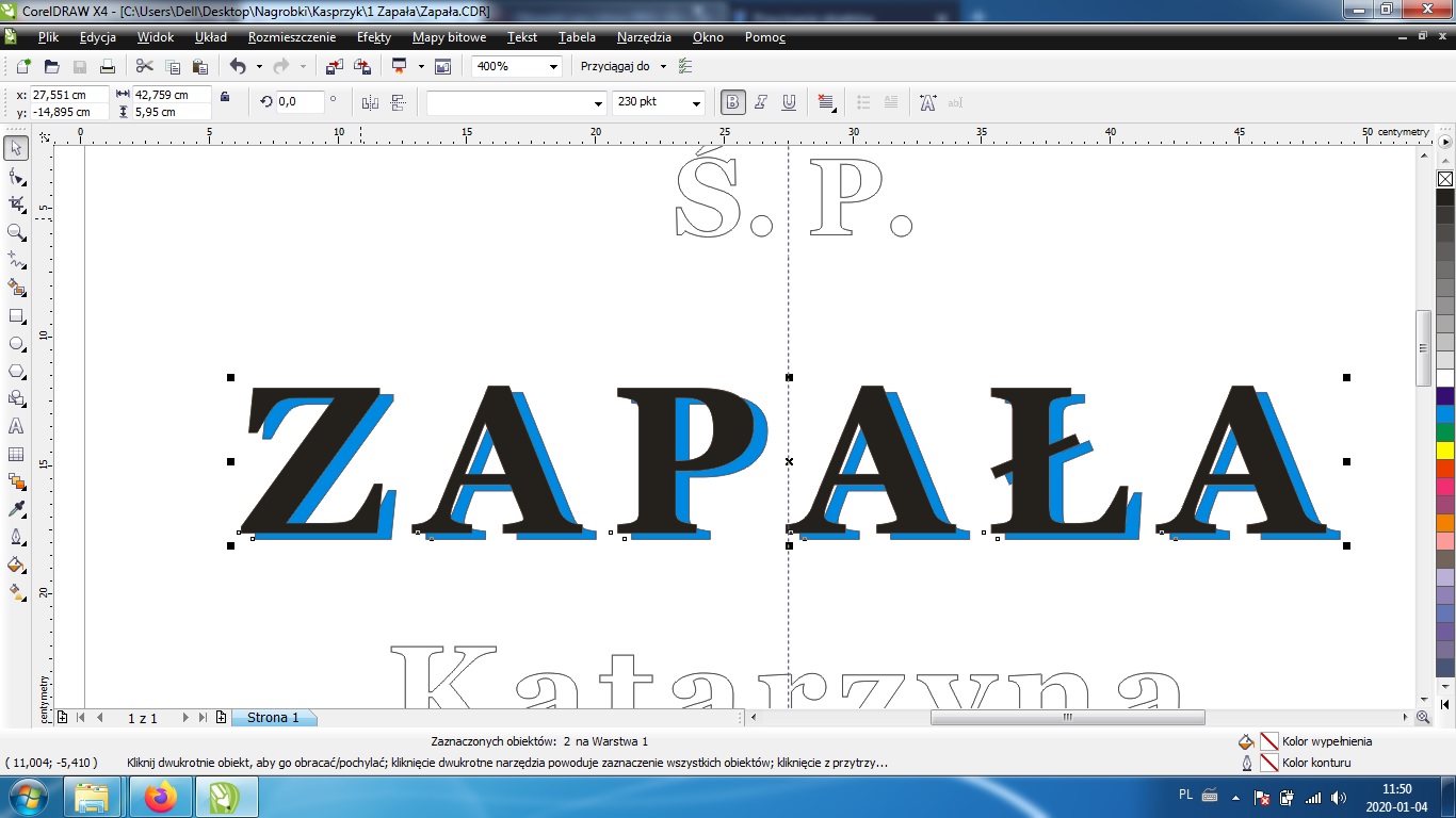 Wielkie dzieki dokladnie o to mi chodzi . Ale nie wiem jak mam przyciac orginalem duplikat ?? nie moge tego znalesc. czy mi mogłbys zrobic w taki sposob i wysłac przykładowy napis nazwisko : ZAPAŁA Czcionka georgia wielkosc 230 pkt