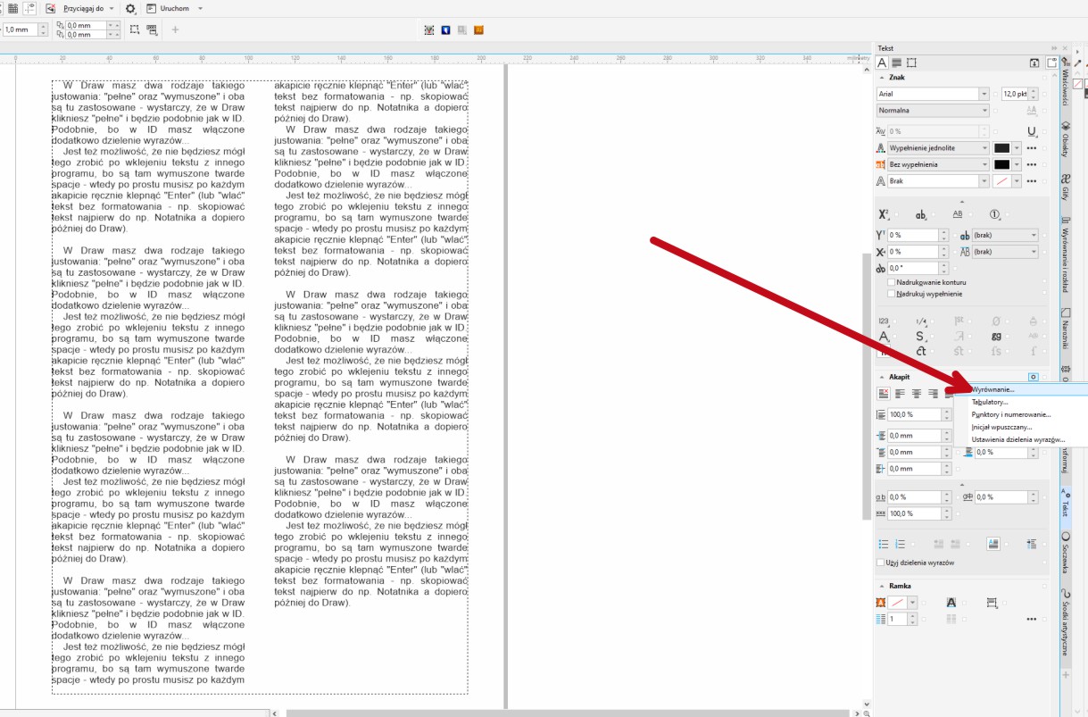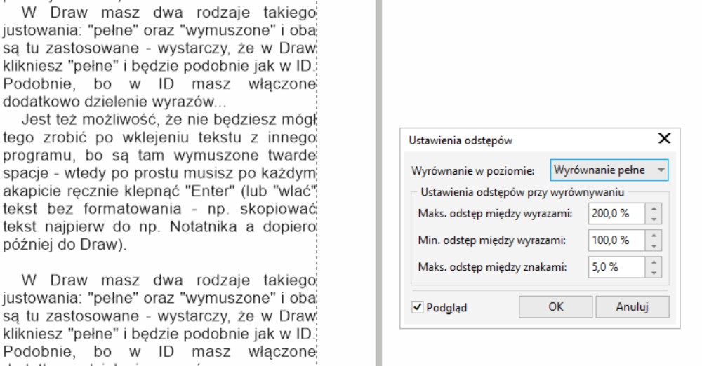 W Draw masz dwa rodzaje takiego justowania: "pełne" oraz "wymuszone" i oba są tu zastosowane - wystarczy, że w Draw klikniesz "pełne" i będzie podobnie jak w ID. Podobnie, bo w ID masz włączone dodatkowo dzielenie wyrazów...