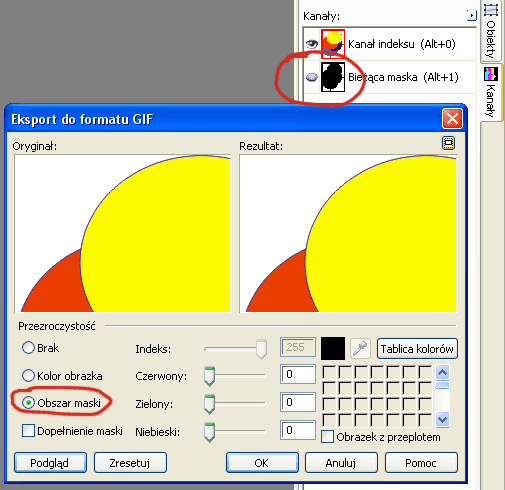 Natomiast co do problemu i gifa w PP oraz maski to w kolejnym okienku po zatwierdzeniu przeksztalcenia do 8 bitowej palety ( - mozna to tez zrobic wczesniej z poziomu edycji programu a nie eksportu) zobaczysz kolejne okienko i tam pod warunkiem ze masz zalozona maske na obiekt (zaklada sie ja skrotem ctrl M) zobaczysz dostepna opcje maskowania gifa -