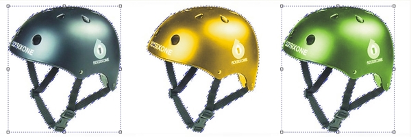 Kask z lewej strony to wersja oryginalna, a złoty i zielony po zmianie koloru