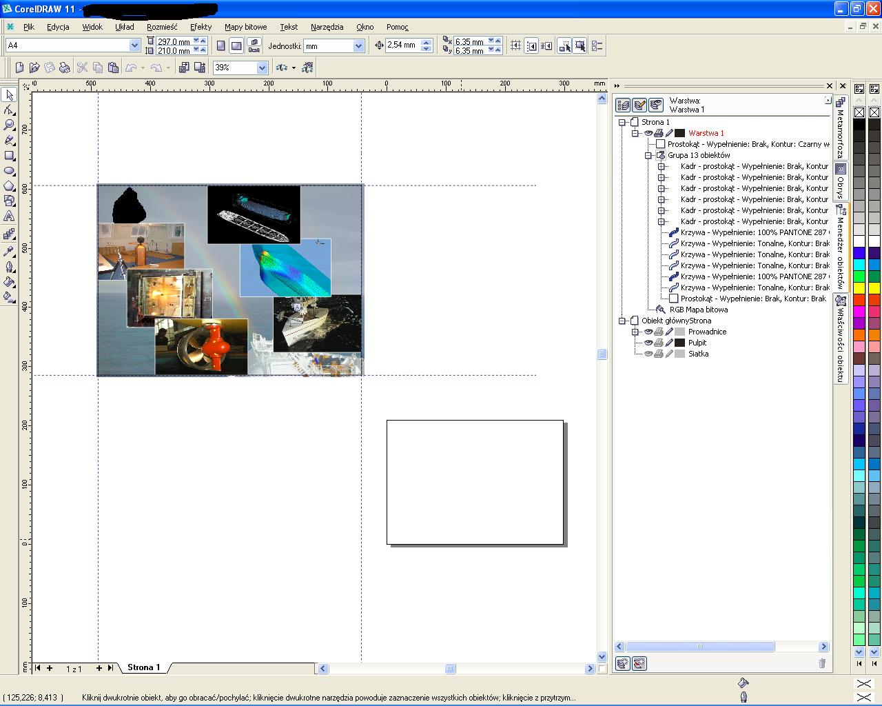 Więc tak, przygotowałem projekt-nie oceniać proszę;)-,który chcę wyeksportować do pdf. Projekt składa się z prostokąta bez wypełnienia, grupy 13 obiektów i RGB mapy bitowej-załączyłem obraz. Po eksportowaniu do pdf jeśli projekt nie znajduje się w obszarze roboczym- A3, A4 itd- w ogóle nie widać wówczas obrazu na pdf, a gdy umieszczę go w tym obszarze i tak rozjeżdża mi się logo i mapa bitowa- tracą kolory i pikselują się.