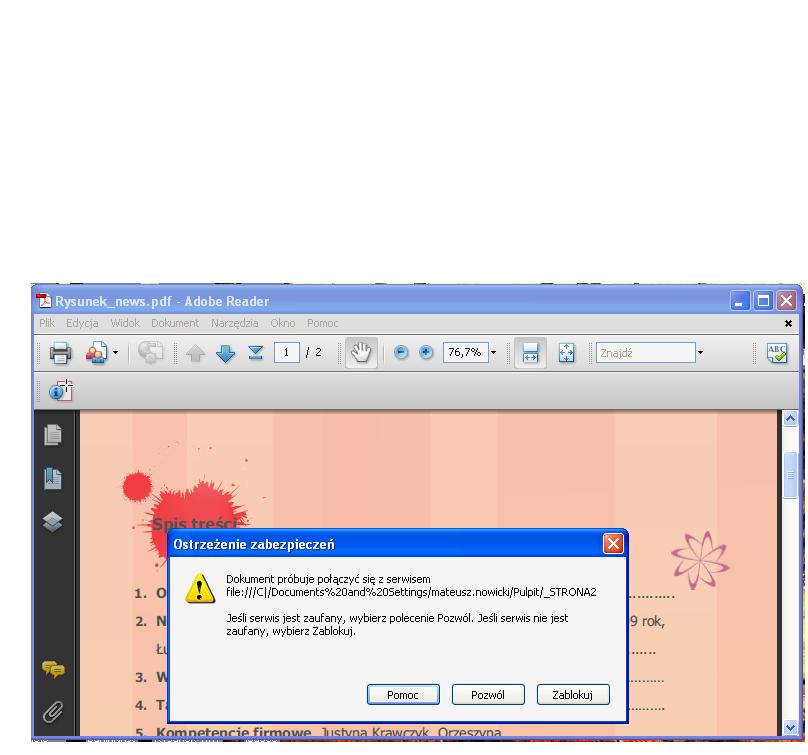 Trochę kombinowałem i efekt mam taki, że po wyeksportowaniu do pdf-a - jak najeżdzam kursorem na pierwszą stronę pojawia się kursor(łapka) z literką W i jak klikam to mi wywala komunikat: "Dokument probuje połączyć się z serwisem STRONA1" (ścieżka odwołuje się do pulpitu)..