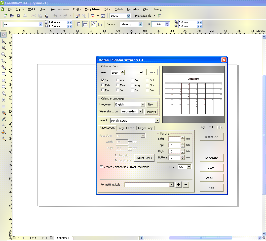opcji Layot widok kalendarza i klikasz na Generate i to wszystko kalendarz masz już zrobiony podstawiasz tło i koniec