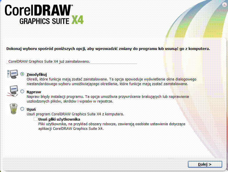 Uruchom instalację programu ,zaznacz opcje Zmodyfikuj