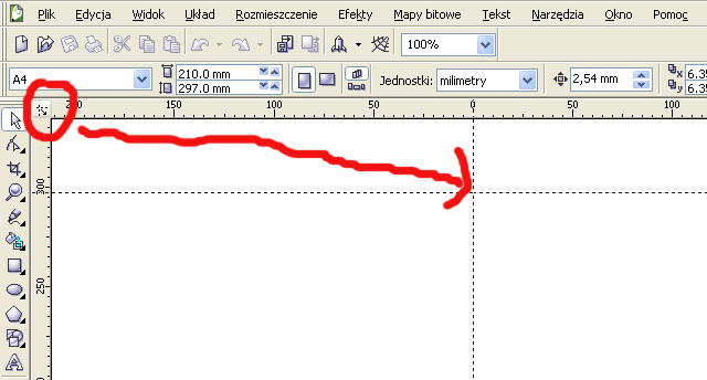 Można to zrobić, rysujesz prostokąt o wymiarze dokumentu (np A4), centrujesz na stronie (klawisz P) tak by się pokrywał z kartką, włączasz przyciągnie do obiektu (alt+z). Wtedy klikasz na ikonkę która znajduje się na zbiegu linijek, lewy górny róg, trzymając klawisz myszy przeciągasz punkt 0,0 w dowolen miejsce, które chcesz a w Twoim przypadku w lewy górny róg.