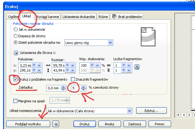 W zalaczeniu scren gdzie masz zaznaczone te wazne funkcje odpowiedzialne za podzial na fragmenty, i drukujesz oczywiscie spod tego corela bezposrednio na drukarke.