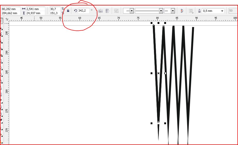 Zaznacz odcinek i wciśnij Alt+F8 (obrót). W okienko kąt wpisz -7 stopni (wartości dodatnie obracają w lewo, ujemne, zgodnie z ruchem wskazówek zegara) i zaznacz pod okienkiem wyboru środek względny, któryś z dolnych kwadracików (odcinek obróci się względem swojego dolnego końca). "Kliknij" Zastosuj do duplikatu. Teraz powinnaś mieć V, w którym lewe i prawe ramię odchylone jest od pionu o 3,5 stopnia, co razem daje 7, które chciałaś. Aha, zapomniałem o grubości. Ustawia się ją narzędziem kontur (stalówka na pionowym pasku z narzędziami), w wyświetlonym okienku musisz zmienić jednostki na pkt, bo standardowo są mm. Grubość linii figury można zmienić w dowolnym momencie. Jeśli ustawisz ten parametr, kiedy nie będzie zaznaczony żaden obiekt, to od tego momentu wszystkie nowe będą miały taką grubość.