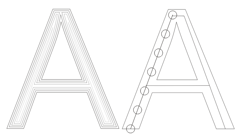 Podepnę się pod temat bo mam praktycznie ten sam problem . Potrzebuje uzyskać linię wewnątrz litery taka jak na obrazku po prawo (to co uzyskałem po lewo jest przykładem, który nie nadaje się do takiego wykorzystania). Linie będzie służyła do poprowadzenia po niej kołek o średnicy 5mm i odstępach co 15mm. Proszę o pomoc ewentualnie wskazówki