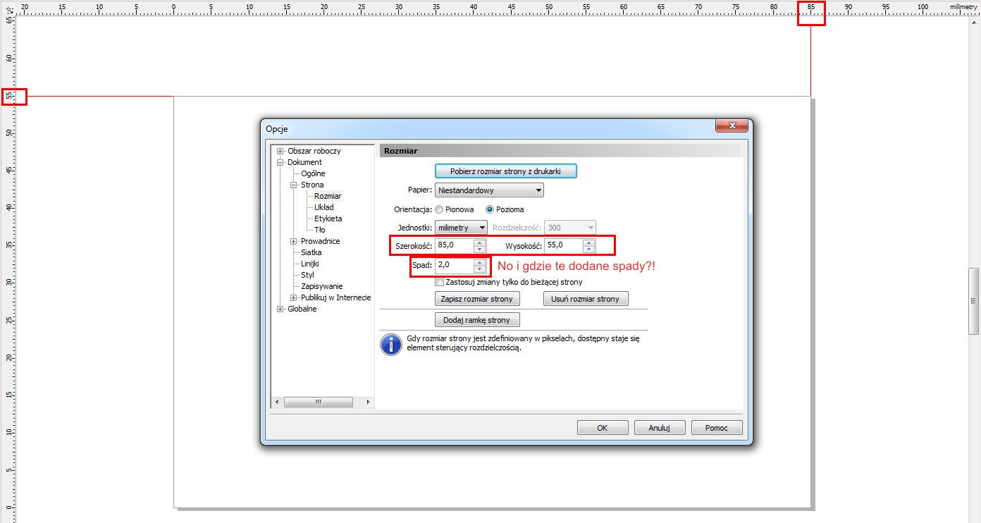 Rozmiar wizytówki: 85 x 55 plus zaznaczam dodanie spadów o wartości 2mm to otrzymuję arkusz pracy o wymiarach... 85x55?! Przecież powinienem tam widzieć arkusz o wymiarach 89x59, no bo przecież 2mm spadów z każdej strony to daje mi obrazek dłuższy w pionie i w poziomie o 4mm. Dlaczego więc widzę 85x55?! Gdybym ręcznie sobie wpisał 89x59 to by było, ale chyba chcę skorzystać z opcji dodawania automatycznego spadów, prawda?