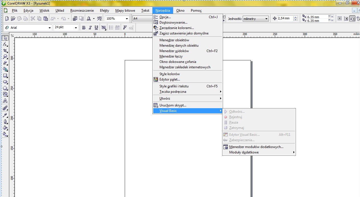 Jak napisałem jest to CorelDraw X4 Special Edition i nie ma możliwości doinstalowania Visual Basic. W programie po próbie uruchomienia narzędzia pojawia się komunikat "nie można uruchomić Visual Basic for Applications. VBA może nie być zainstalowany. Spróbuj ponownie....". Wyczytałem że wersje OEM, Home i Student mogą być pozbawione tego narzędzia, jednak to jest niby pełna wersja pudełkowa pozbawiona dokumentacji papierowej i dodatkowych materiałów typu cliparty, zdjęcia itp.