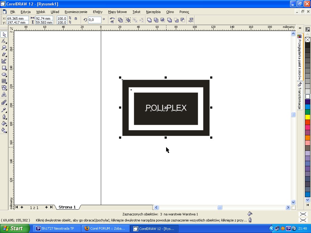 Szablon zawiera napis w ramce. Napis i ramka sa czarne. Potrzebuje otrzymac identyczny szablon jednak w negatywie, cyli ciemne tlo, jasny napis (tu oczywiscie nie ma problemu) jednak problematyczne jest uzyskanie jasnej ramki otoczonej ciemnym tlem (na kilka centymetrow) Chodzi o to aby ploter grawerowal WYPUKLE literki i ramke, czyli musi jeszcze wygrawerowac te kilka centymetrow poza ramka - poza szablonem. Czy jest jakas opcja pozwalajaca uzyskac taki efekt ? Kiedy wkladam szablon w stworzona ramke, to przy laczeniu dzieja sie jak dla mnie rzecy niezrozumiale, nie jestem biegly w corelu. poprosze o pomoc. Mam nadzieje, ze problem jest w miare zrozumialy :)