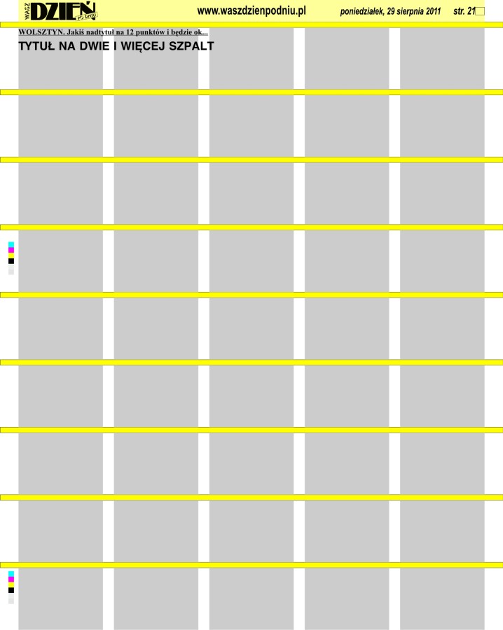 Nie wiem czy jakiś odgórny nakaz składu w konkretnym programie miałby jakiś sens skoro drukarnie i tak zapewne w większości żądają do druku pdf-a. (nie ważne czym robisz, ważne efekt końcowy w postaci pliku pdf). Ja osobiście składam gazety w Corelu choć wielu userów tego forum pisało mi już, że korki się do tego nie nadają i są do tego inne programy. Ja nie narzekam... Owszem robota czasem może trochę ręczna, ale Corel daje radę (ponoć dość szybko składam czasopisma o objętości 12, 24 kolumny, byłoby więcej - nie ma sprawy). Ważne, żeby zrobić na początek porządną makietę (wymiary itd.), a potem to już z górki i tylko układanie klocków. Jedyne co może przeszkadzać, to trochę ,,niepewne'' dzielenie wyrazów, które trzeba sprawdzić, bo Corel sobie z tym tak do końca nie radzi (ale widziałem gdzieś jakieś makro...). Tutaj próbka produkcji corelowskiej http://www.wolsztyn.pl/pages_news_pl_3242.html a w załączniku moja przykładowa makieta ,,prawej'' kolumny (szare prostokąty bardzo wygodne przy układaniu modułów z reklamami; w Corelu, w surowym projekcie strony, poza nią mam umieszczone gotowe (wymiary, szpalty) prostokąty tekstowe na 1, 2, 3, 4, 5 szpalt; wystarczy wlać w taki prostokąt tekst i przeciągnąć na stronę, a potem to już tylko ,,do środka" jakiegoś prostokąta i do góry żółtego paserka, dwa szybkie skróty klawiszowe i z bańki).
