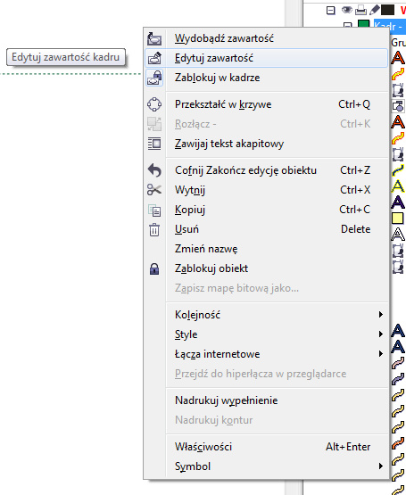 Wchodzimy w EFEKTY -> SZYBKIE KADROWANIE mając zaznaczone zgrupowane elementy jakie chcemy w czymś umieścić, potem wskazujemy obiekt w jakim je chcemy zamieścić i nam równo obcina z brzegów. Można potem w menedżerze obiektów kliknąć PPM na kadr i wybrać EDYTUJ. Jednakże ta opcja nic nie powoduje, bo nie mogę nic zmienić, przesunąć, usunąć. To co to niby za wielka edycja?