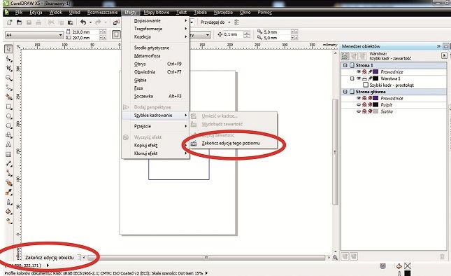 I rzeczywiście jak ktoś wcześniej napisał w lewym dolnym rogu strony jest przycisk zakończenia edycji kadru [w CorelDraw X5].