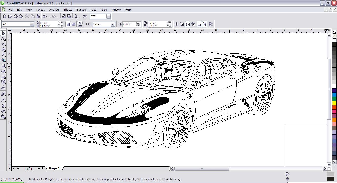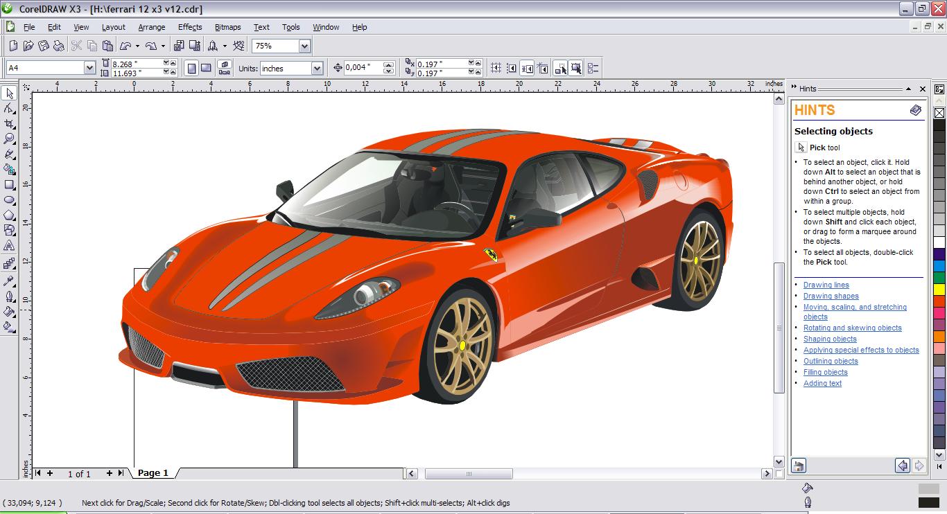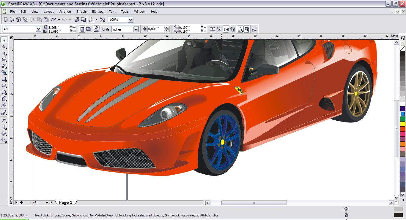 Do rysowania samochodu używałem tylko łamanej aby nadać kształt, przeźroczystości oraz nie wiem jak po polsku "Interactive Contour Tool" do robienia tych cieniować przy masce i przy prawym świetle.