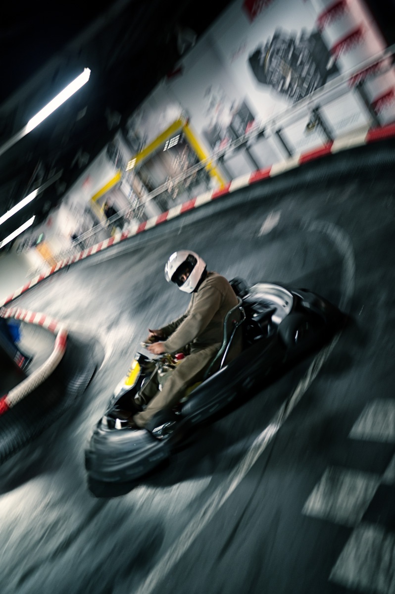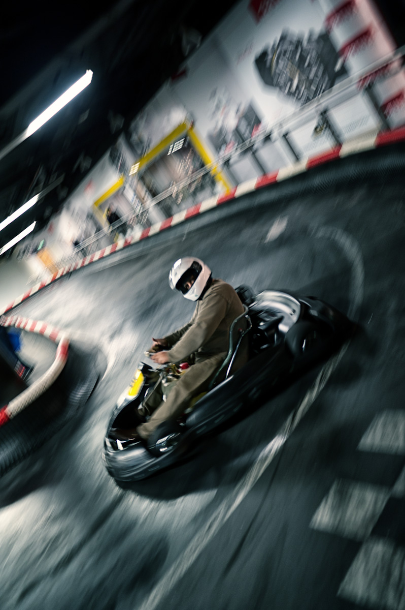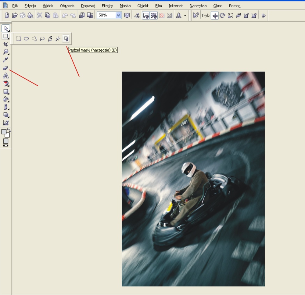 Przy pomocy narzędzia pędzel maski zaznaczasz kawałek gokarta, później dajesz ctrl+shift+strzlka w gore by odrebnic obiekt. Teraz rozszerzasz odpowiednio wg swoich upodobań obiekt (tylko bez przesady bo się pixele zaczynaja pokazywać). Później przy pomocy gumki wtapiasz boki obiektu by był wkomponowany w tło.