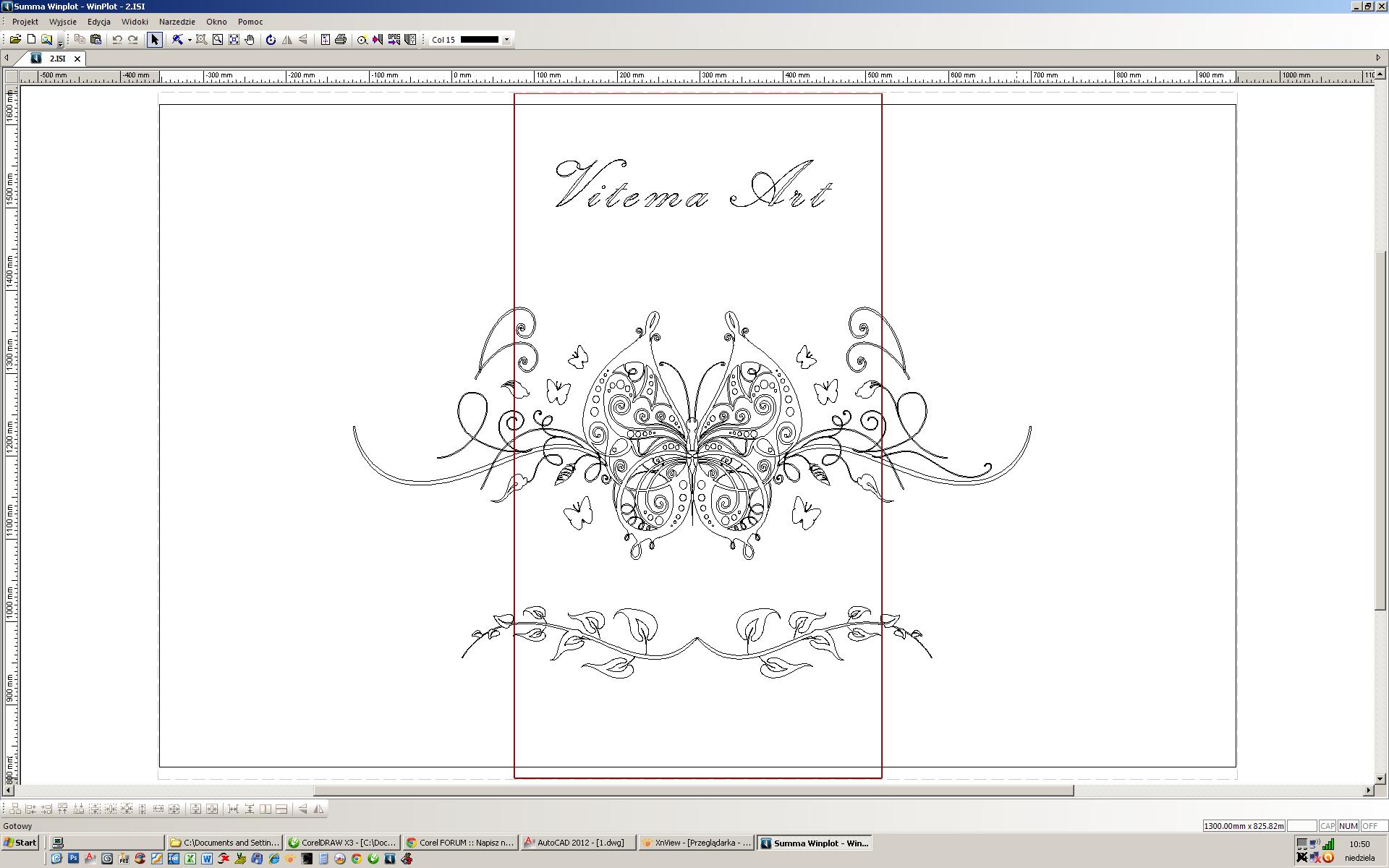 Projekt ma wymiary 1300x800 mm. Mam ploter tnący który max przyjmuje 575 mm (summa d60 fx). Muszę pociąć ten projekt na 3 części aby go wrzucić na ploter.
