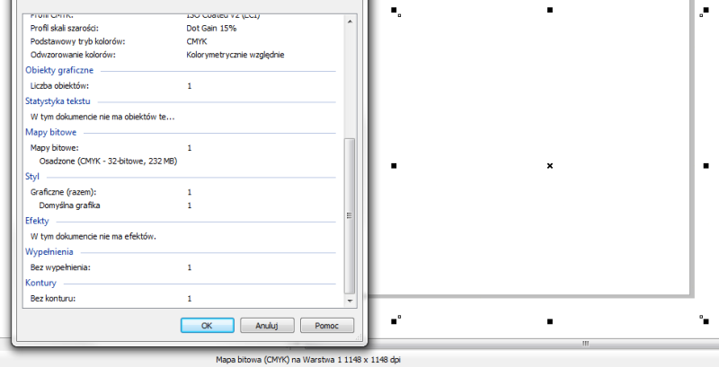 | Na obrazku powyżej, we właściwościach (specjalnie je dołączyłam do zrzutu ekranu) widać, że ta bitmapa nie tylko jest, ale ma 232 MB. Jak na przeźroczystość to sporo. I sugerowałoby, że jednak gdzieś jest. Pytanie - gdzie? Gdzie ją Corel ukrył? |