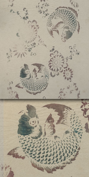 Tak, ale nie była to 100% powtarzalność aby uzyska przejście tonalne robiono tzw. nie dodruk na kolorze nakładanym, W dzisiejszych czasach istnieje specjalna technika zwana"mokre w mokre" zwłaszcza na tkaninie przy użyciu farb wodnych (choć nie tylko). Sitodruk rozwiną się głównie jako wynik zakazu cesarskiego dotyczącego noszenia malowanych kimon więc zaczęto je drukować. Znalazłem przykład starodruku proszę zwrócić uwagę na pyszczek ryby