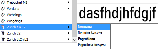 No wiec potwierdzam słowa Bidona — czcionka jest w porządku i to do tego stopnia, że mój Corel na nią nie wybrzydza. To jest Zurich Condensed, do którego ktoś dorobił polskie znaki (stąd L2 - latin 2). Mój Zurich Condensed BT nie ma wersji pogubionej. Zawiera polskie znaki i są wszystkie odmiany - przez kursywę do pogrubionej kursywy. Podobny krój ma Swiss 742. Jeśli więc Corel gubi formatowanie, to znaczy, że coś jest nie tak ze środowiskiem i samym programem.