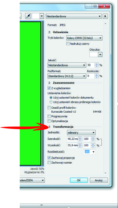 Podczas eksportu do JPG nie mam okna ustawień... i np: zawsze eksport mam JPG w 300dpi i kolory cmyk... nie mam możliwości zmianych tych ustawień...