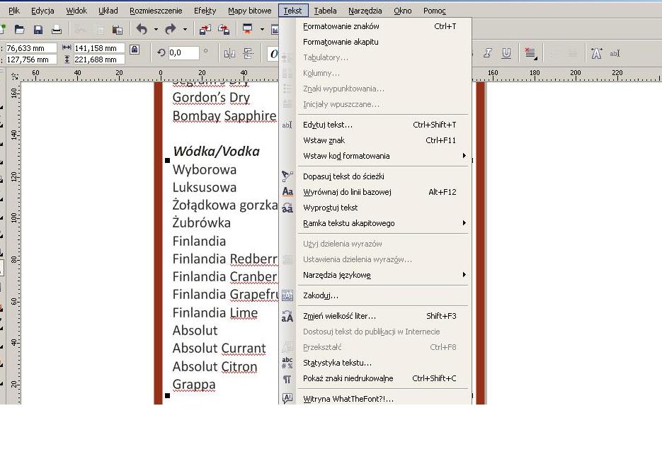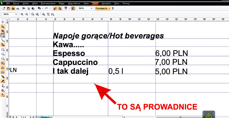 Klikajac myszką na krawędzi obszaru roboczego ściągasz prowadnice. Można je dowolnie ustawiać i pod dowolnym kątem. Ustawiasz je więc tam gdzie są Ci potrzebne. Tworzysz linijki i tabelki gdzie ma być wpisany tekst. Następnie w innym miejscu piszesz to co Ci potrzebne. Nazwę wina, cenę itp. Oczywiście nie ciągiem. Nazwa jako tekst oddzielny cena tez itp. (piszesz wszystkie nazwy, ceny ...)Przeciągając tak napisany teks w okolicę wybranych prowadnic on sam niejako przykleja się do wskazanego miejsca. Oczywiście wcześniej pisząc określasz rodzaj i rozmiar czcionki. Inaczej tego wytłumaczyć nie potrafię.