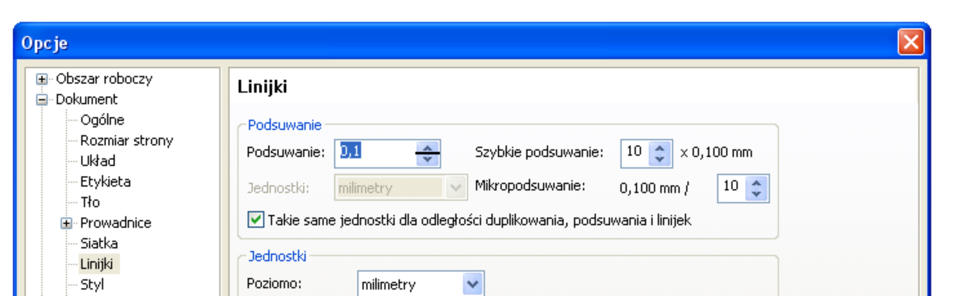 | W menu Opcje trzeba wybrać Dokument, a w nim Linijki. Tam należy zaznaczyć opcję Takie same jednostki dla odległości duplikowania, podsuwania i linijek. Nie wiem jak jest po angielsku, choć po polsku chodzi o wartości... W menu Opcje, Ogólne warto też ustawić odległość w jakiej pojawi się zduplikowany obiekt. Gdy pracuje się z dużym powiększeniem zduplikowany obiekt znika z ekranu i trzeba pomniejszać, by go znaleźć. Niewygodne. |