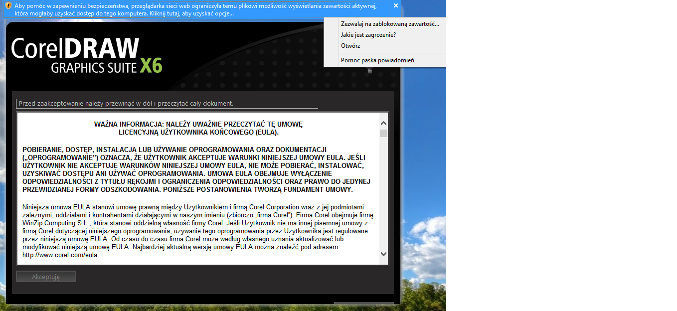 edit: wersja pod x32 (również pobrana z corel.com) nie wyrzuca już komunikatu o blokowaniu zawartości. ale problem jest ten sam - przycisk akceptacji regulaminu nie jest aktywny po przewinięciu regulaminu. |