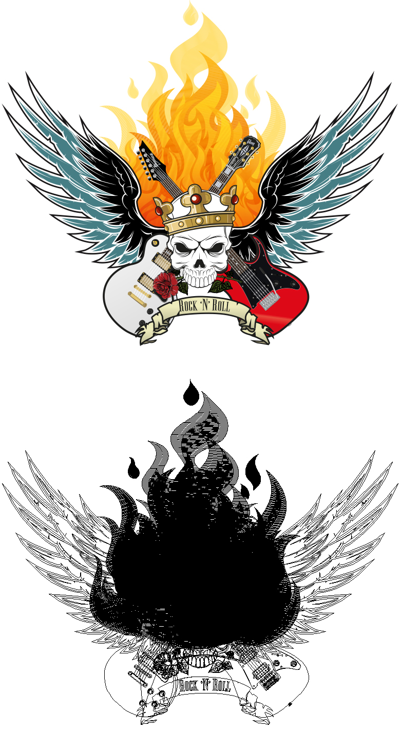 I ostatnia sprawa - widzę, że ogień czy może jeszcze inne obiekty zostały zassane z neta zapewne, z jakiegoś darmowego vector-stocku i zaimportowane z AI lub EPS, który wypełnienia tonalne szatkuje i każdy ton gradientu jest osobnym obiektem w jednolitym kolorze (dlatego widok szkieletowy pokazuje praktycznie czarny obrazek). CZASEM (znów zależy) automatyczne tworzenie granicy nie radzi sobie z tym za dobrze, więc możesz "kawałkami" scalić fragmenty projektu (nieistotne co z czym, byleby ich zewnętrzna krawędź była właściwa) i jak projekt się troszkę uprości, wtedy zastosuj granicę. |