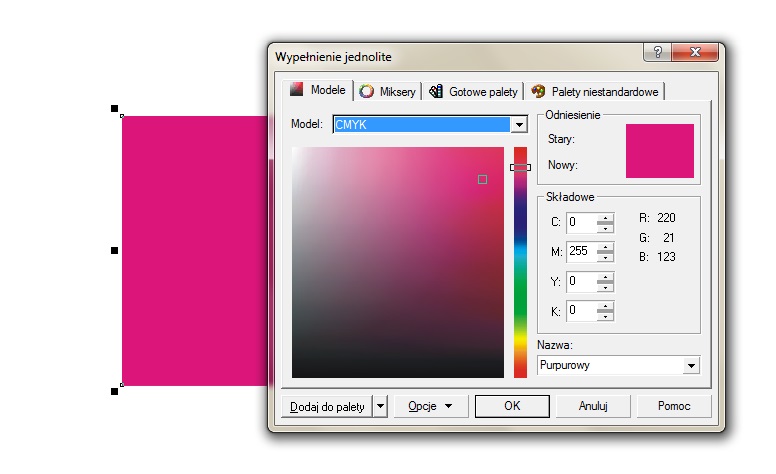 Zaznaczyłam ten kwadrat weszłam w wypełnienie jednolite(okno dialogowe) i pojawiło się to co widziemy na screenie 2. czyli model CMYK?