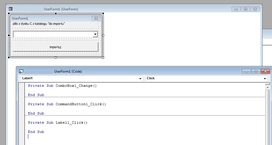 Po kliknięciu w przycisk ComandButton1 plik zostaje zaimportowany do aktualnego arkusza.
