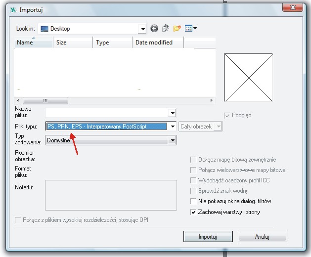 Sprobuj przy importowaniu wybrac Pliki Typu: PS, PRN, EPS - Interpretowany PostScript